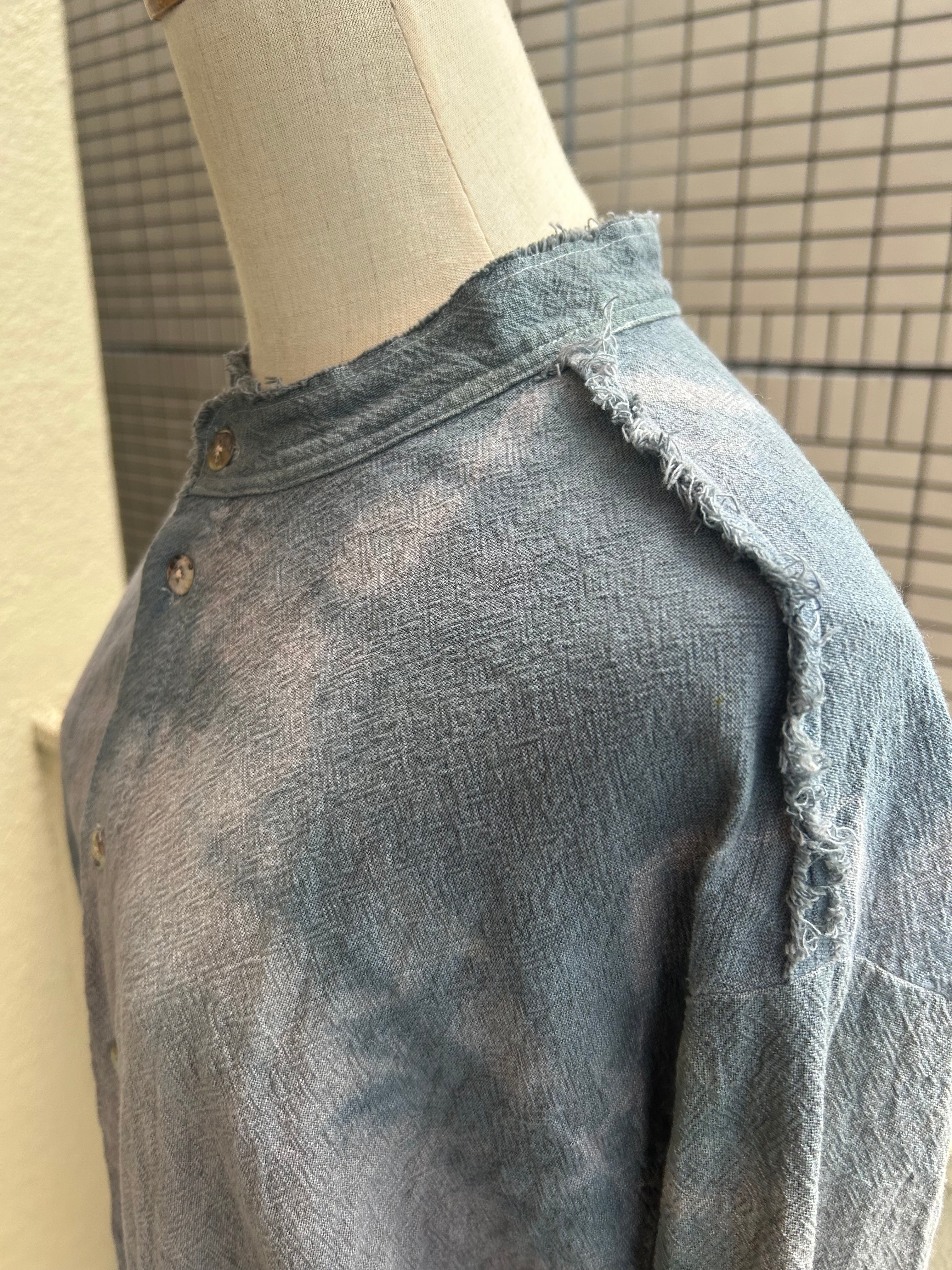 肩、襟、裾ともにカットオフ仕様のリネンシャツです。